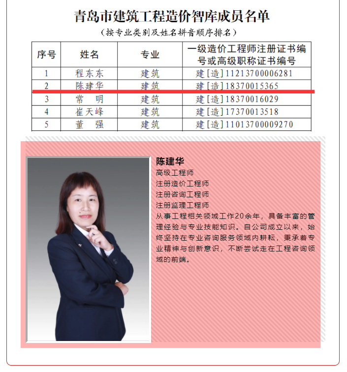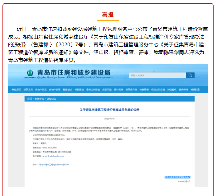 日月动态 我司陈建华同志评选为青岛市建筑工程造价智库成员