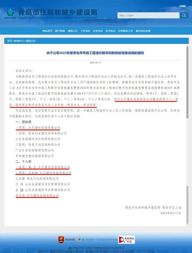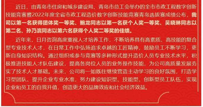 日月咨询在2022年度青岛市市政工程造价数字创新技能竞赛中荣获团体一等奖等多项荣誉