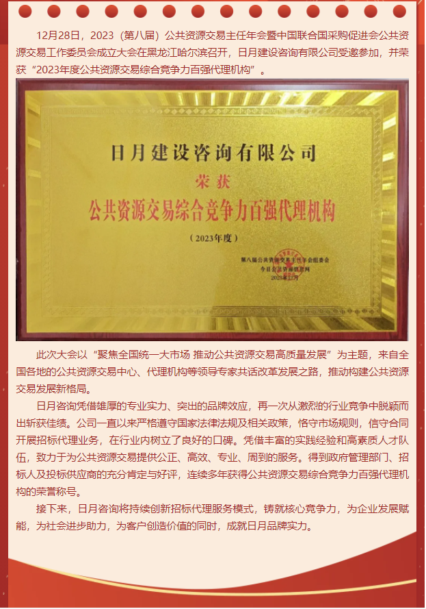 喜报 日月咨询荣获2023年度公共资源交易综合竞争力百强代理机构