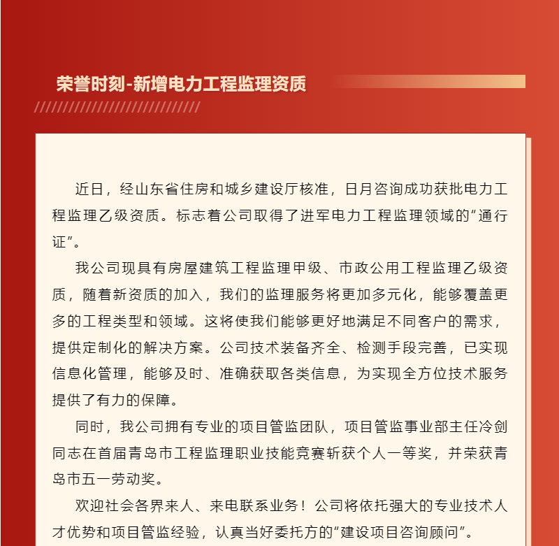 喜报丨日月咨询新增电力工程监理资质、 项目管监事业部冷剑同志荣获青岛市五一劳动奖