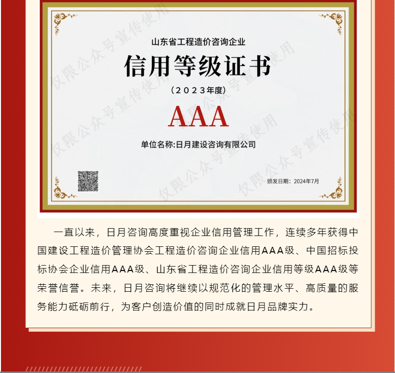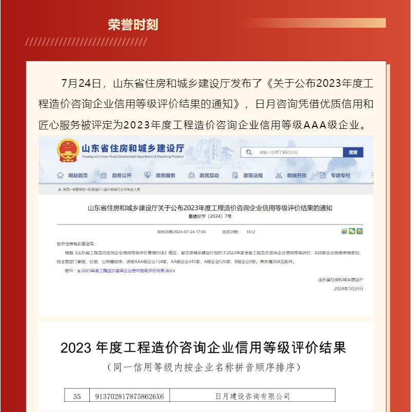 喜报 日月咨询荣获山东省2023年度工程造价咨询企业信用等级AAA级