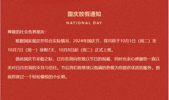 盛世华诞 喜迎国庆 日月咨询祝大家国庆节快乐!祝愿伟大的祖国繁荣昌盛!