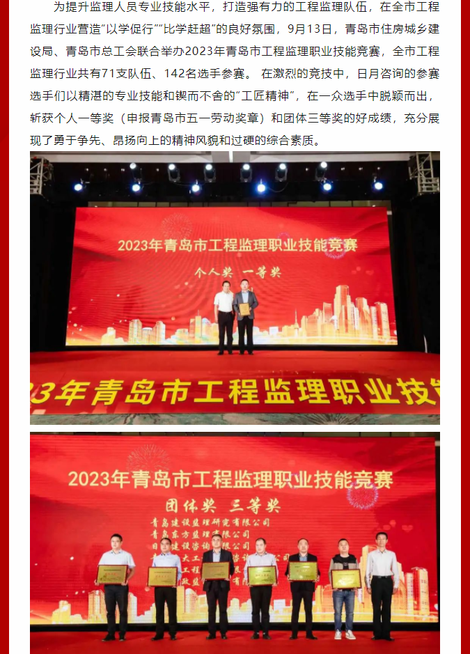 热烈祝贺日月咨询在2023年青岛市工程监理职业技能竞赛荣获个人一等奖、团体三等奖