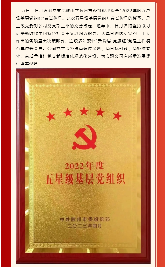 喜报 日月咨询党支部被中共胶州市委组织部授予“2022年度五星级基层党组织”荣誉称号