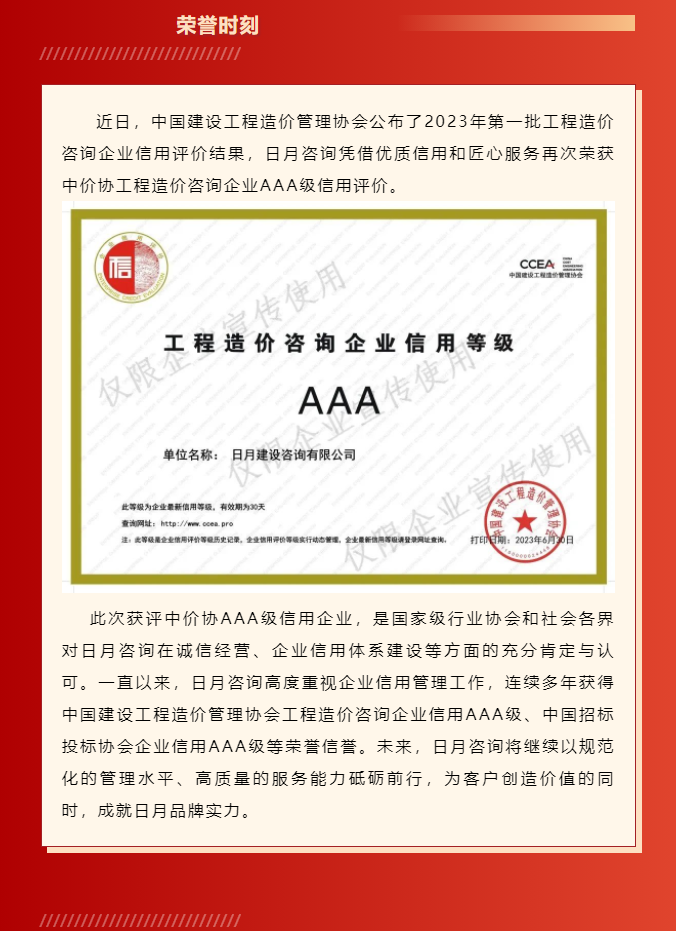 喜报 日月咨询蝉联中价协工程造价咨询企业AAA级信用评价