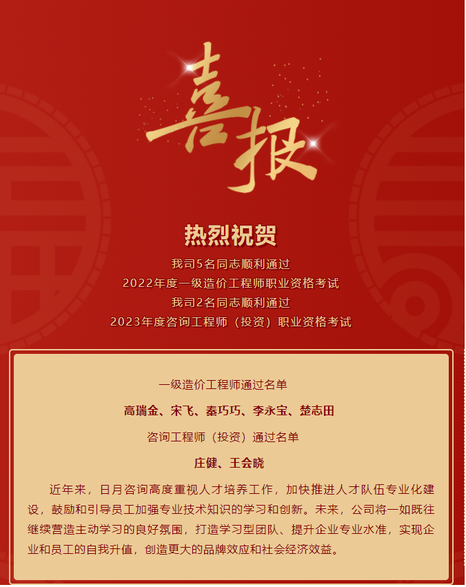 喜报丨日月咨询5名同志通过一级造价工程师职业资格考试、2名同志通过咨询工程师(投资)职业资格考试