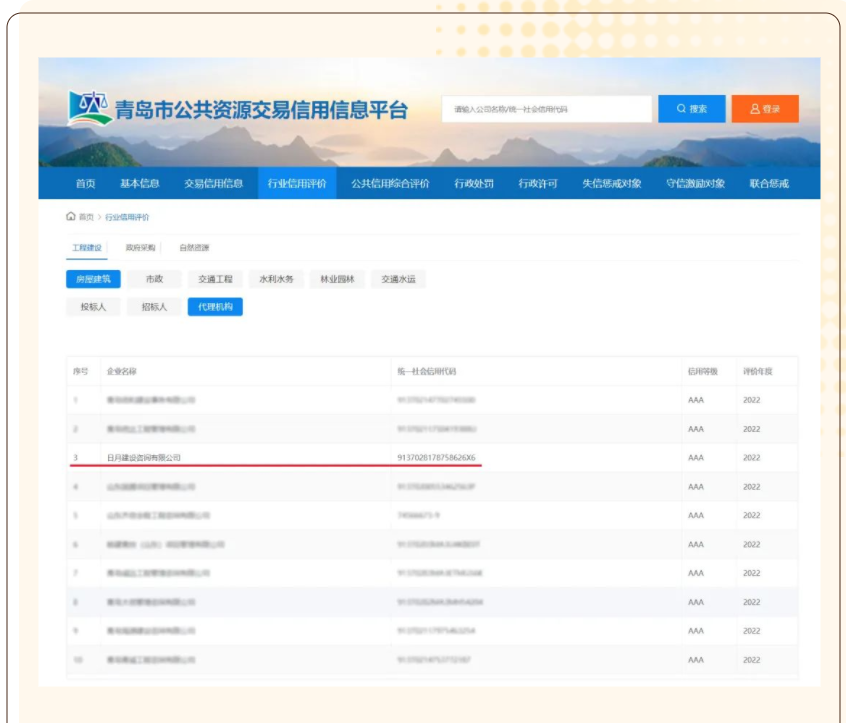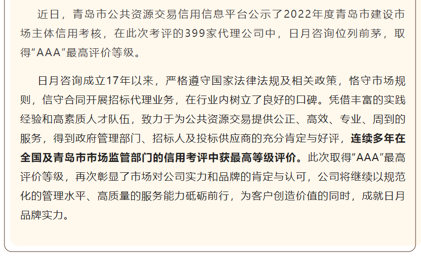 喜报 日月咨询在2022年度青岛市公共资源交易市场主体信用考核中取得“AAA”评价等级