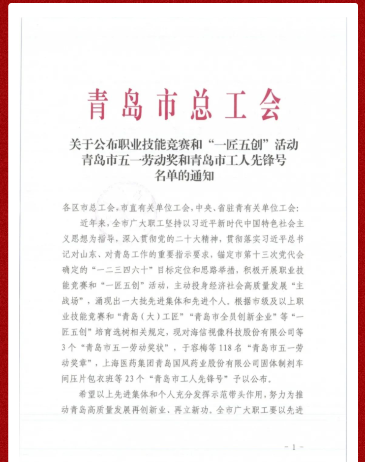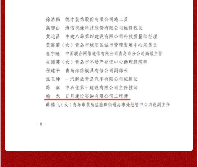 热烈祝贺我司鲍龙同志荣获青岛市五一劳动奖章